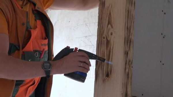 Чтобы ускорить процесс и усилить искусственное старение, перед началом работы с дрелью или болгаркой можно опалить дерево газовой горелкой. Важно не удерживать горелку слишком долго на одном месте, чтобы предотвратить загорание смолы.