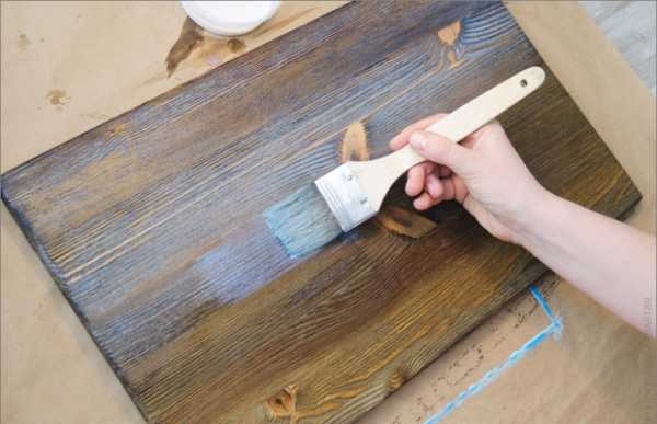 Последний этап – покрытие лакокрасочными материалами. Используйте краску и лак на свое усмотрение. Совет, чтобы искусственно состаренное дерево выглядело максимально реалистично, углубления окрашиваем в светлые оттенки, а выпуклые части – в более темные. Если вы приняли решение красить доску в один светлый оттенок, после высыхания обработайте поверхность наждачной бумагой, чтобы темные детали проявились. После окончания работы закрепляем отделку лаком. Чтобы усилить результат вместо обычного лака можно использовать кракелюрный. После высыхания он трескается, в пустотах виден нижний слой краски.