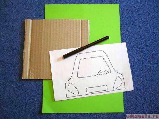 Следующим этапом вырезаем контуры машинки по шаблону из бумаги с небольшим прямоугольником вверху для крепления к картону.