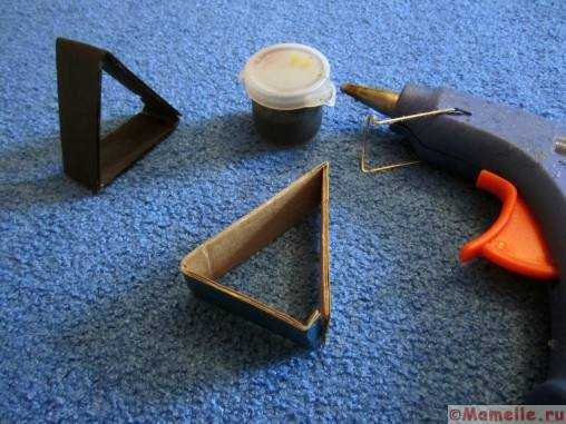 Вырезаем две полоски шириной два сантиметра и длиной примерно десять – пятнадцать сантиметров. Это будут колеса – подставки. Их необходимо согнуть в виде треугольников, скрепить клеем и покрасить в черный цвет.