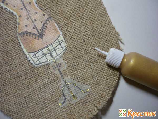 На этом этапе можно ещё раз прорисовать детали рисунка на ткани. В данном случае контуры дополнительно обведены черной краской.