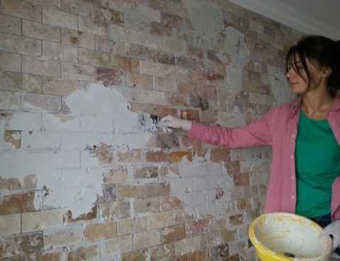 Побелку, грунтовку, штукатурку надо полностью удалить. Для этого можно воспользоваться раствором уксуса с водой либо смесью воды, стирального порошка и соли (около 30 грамм). Полученный состав распыляется на стену, а затем обрабатывается ветошью.