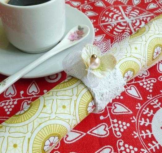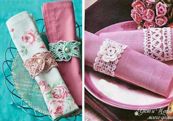 Свернутую в трубочку салфетку можно украсить полоской вязаного кружева, так же как и тканью. При этом не обязательно выполнять застежку на пуговицы, ведь вязаное полотно легко тянется.