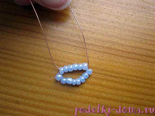 Теперь нужно сформировать кольцо. На кончики нанизываем по одной бисеринке и один конец продеваем через бисеринки в начале.