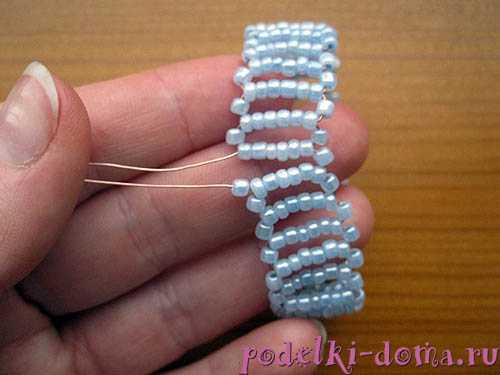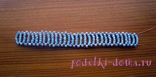 По такому же принципу нанизываем бисеринки и затягиваем кончики до тех пор, пока не получится бисерная полосочка нужной длины.