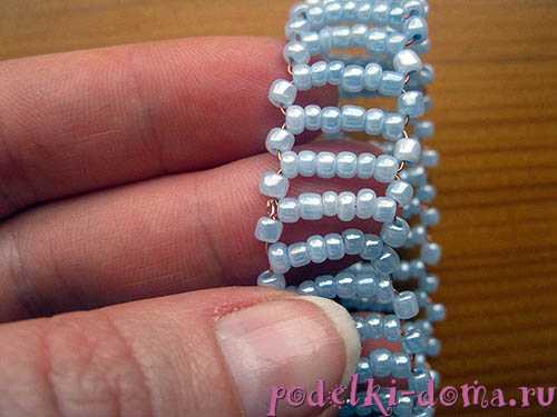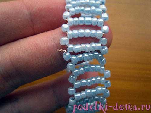 Таким образом плетем до желаемой длины. Следует учесть, что нанизывая по четыре бусинки на конец, нужно чередовать цвета бусин. То есть, следующие четыре бусинки нанизываем в таком порядке: две светлые, одна темная, одна светлая. На второй конец — одна светлая. Следующие четыре бусины все светлые. И так чередуем до конца. В последней низке все бусины должны быть светлые.