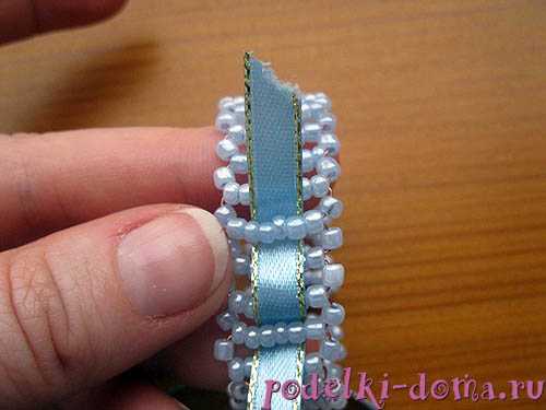 Через поперечные низки бисера пропускаем ленточку так, чтобы она проходила под одной низкой и над двумя низками.