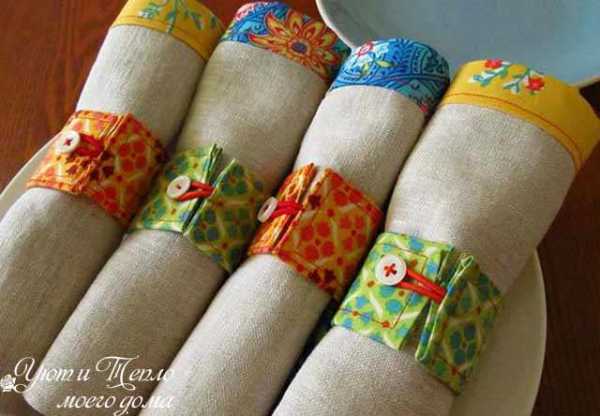 Красивое украшение для столовых салфеток можно сшить из кусочков ткани и сделать застежки на пуговицах. В этом случае и жесткие кольца для основы не нужны.