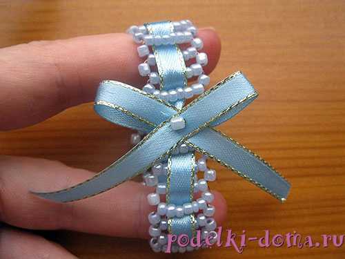 В центре готового бантика пришиваем бисеринки и приклеиваем бантик к колечку.