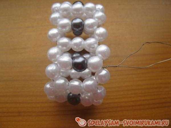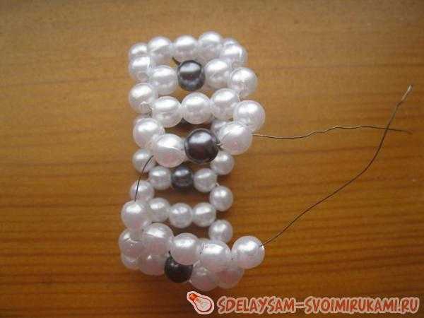 Завершаем плетение, нанизав светлые бусинки на кончики и продев один из них в первые три бусинки.
