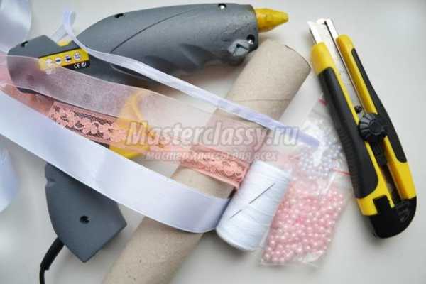 Подготовим необходимые материалы и инструменты. Широкая атласная лента для основы. Для бантика нужна будет лента из органзы, чуть уже лента из гипюра и узкая атласная ленточка. Декорировать будем бисером двух цветов. Для колец подойдут рулоны из-под бумажных полотенец, фольги, пекарской бумаги или пищевой пленки. Ножницы, клеевой пистолет или другой прозрачный клей. Иголка с ниткой для сшивания бантика и канцелярский нож.