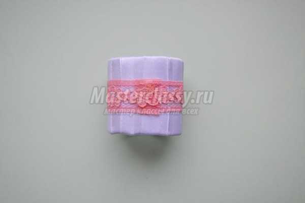 Теперь начинаем обвивать картонное кольцо лентой. Каждый новый виток делаем внахлест. Лента должна плотно облегать кольцо. Край промазываем клеем и приклеиваем его с внутренней стороны.