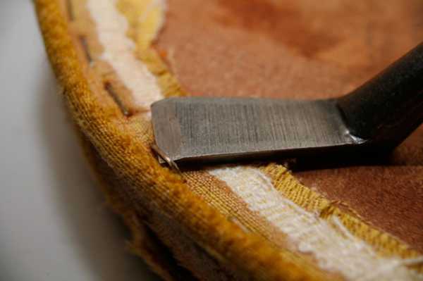 Для начала удаляем старую обивку, используя плоскую отвёртку. С её помощью поддеваем скобу, раскачиваем и достаём. В том случае, если скобы сидят прочно, их слегка выдвигаем отвёрткой, а затем вытаскиваем плоскогубцами. Проверяем качество подложки. Если она в хорошем состоянии, новую обивку можно натянуть поверх её.