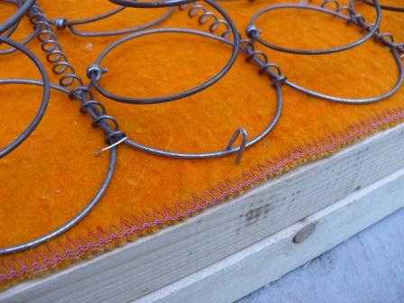 Расправляем полученные заготовки на ровной поверхности лицевой стороной вниз. На середине размещаем подушку, также лицевой частью вниз. Подворачиваем ткань заготовки со всех сторон и фиксируем её скобами к деревянному каркасу. Скобы должны располагаться на небольшом расстоянии до 4 см одна от другой.