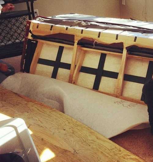 Что касается наполнителя. В 95% случаев его необходимо выбросить. Взамен изношенному нужно приобрести новый поролон средней или высокой степени жесткости с высокими показателями плотности. Его высота должна быть не менее 45-50 мм, а лучше и вовсе – 60 мм. Это не только сделает сидение более упругим и придаст ему привлекательную форму, но и защитит внутренние детали от поломок. Чтобы обеспечить более длительный срок эксплуатации самого наполнителя, его рекомендуют обмотать несколькими слоями синтепона. Если нужно поменять наполнитель и в спинке, можно использовать поролон менее высокой степени жесткости. Это сделает ваш отдых более комфортным.