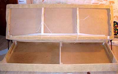 Если вы обнаружите треснувшие деревянные перекладины, их тоже нужно заменить в обязательном порядке. Для этого выбирают хорошо просохшие деревянные балки без сучков и трещин. Наличие таких дефектов будет служить концентраторами напряжения, и под большой нагрузкой вскоре перекладина опять лопнет. Сырое дерево, постепенно подсыхая под действием температуры в квартире, будет деформироваться, что может вызвать перекос всего каркаса.Мастера советуют пропитывать клеем ПВА стыки новых и старых балок перед повторной сборкой. В старых моделях каркас имеет три перемычки из ДВП, одну посредине и две по бокам. Очень часто они тоже лопаются после многих лет эксплуатации. Чинить такие детали бесполезно. Лучше выполнить полную замену. Крепить перемычки к каркасу можно с помощью небольших гвоздиков, более быстрый способ – использовать пневматический степлер.