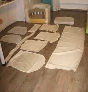 - Расстелите ткань на полу, разместите на ней все части снятой старой обивки.