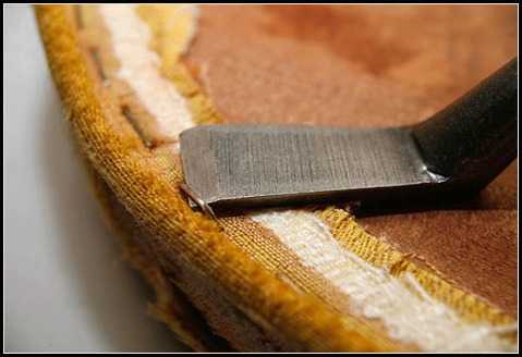 - В местах крепежных отверстий необходимо вырезать небольшие аналогичные отверстия и в обивочной ткани. Края ткани вокруг отверстия нужно закрепить скобами.