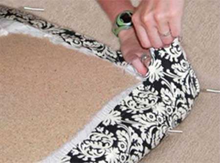 - Надев чехол на деталь, расправляйте ткань гладящими движениями. Слишком сильно натягивать ткань не нужно, иначе она начнет морщится. Если быльца имеют скос, следите, чтобы ткань ложилась равномерно, без характерных загибов. Начинать крепить скобки лучше с самой видимой части, постепенно двигаясь к концу или углам, где недостатки будут незаметны.