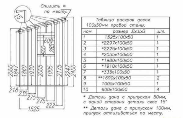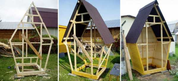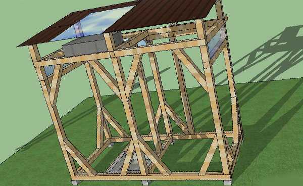 - Из бруса собирают каркас передней, задней и боковых стенок. При этом передняя стенка должна быть выше задней не менее чем на 10 см, это обеспечит необходимый уклон крыши.