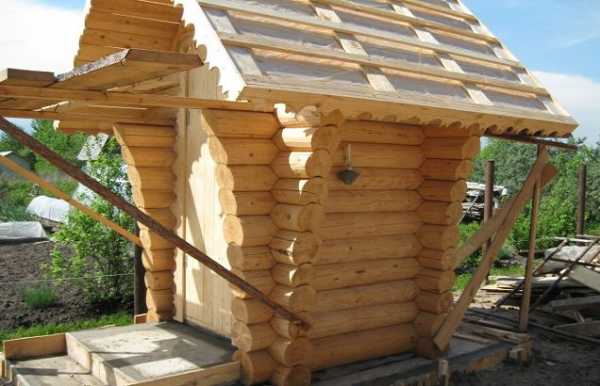 - Обвязка крыши туалета. Продольные брусья для крыши должна выступать за пределы корпуса туалета на 30 – 40 см. Спереди навес будет служить козырьком, а сзади – для отвода дождевой воды подальше от туалета.