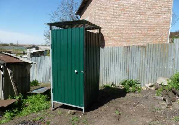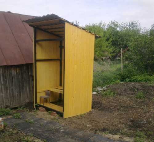 Вместо дерева можно использовать листы профнастила, шифера или другого материала. С ними намного легче работать, так как потребуется всего три листа для задней и двух боковых стенок. Но в таком туалете значительно менее комфортно находиться, чем в деревянном. А все потому, что не происходит естественный влажностный и воздушный обмен через стены.