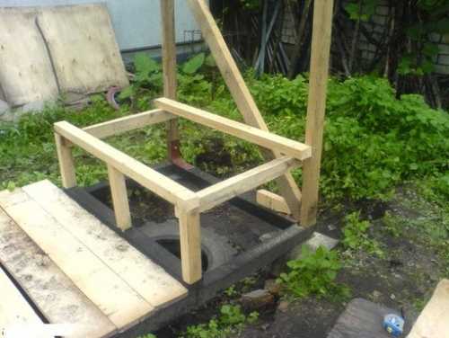 Сверху яму накрывают, брусьями, шифером или бетонируют, оставляя открытым только участок под стульчаком, и приступают к сборке туалетного домика.