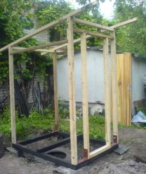 Каркас дачного туалета можно изготовить из деревянного бруса 50х50 мм или 80х80 мм. Более толстый и массивный брус 100х100 мм и больше брать не обязательно. Также можно использовать металлические уголки.