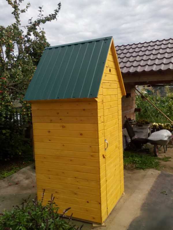 Крышу дачного туалета обычно кроют тем же материалом, что и все постройки на участке, чтобы строения не выбивались из композиции. Можно использовать листы профнастила или металлочерепицу. В крыше необходимо выполнить отверстие для вентиляционной трубы, которое затем следует тщательно герметизировать.