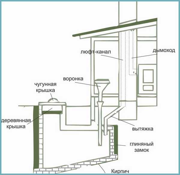 - Из выгребной ямы обязательно должна идти вентиляционная труба. Проводить ее необходимо через дымоход печи или камина. В свою очередь из дымохода должна идти труба в яму, через которую будет поступать теплый воздух. Это необходимо, чтобы яма не замерзала. Материал вытяжной трубы – асбестоцементная или керамическая.