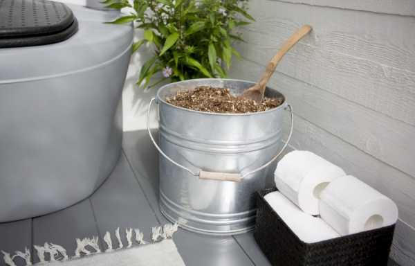 - Туалет без выгребной ямы или пудр-клозет обустраивают, если грунтовые воды залегают очень высоко или если туалетом мало пользуются. В данном случае емкостью для сбора нечистот может быть все что угодно, кроме ямы (ведро, бочка, пластиковый бак). Нужный объем определяет интенсивность пользования санузлом.