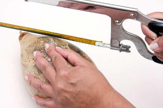 - Возьмите высушенную тыкву. Ножовкой отрежьте под углом верхнюю часть, это отверстие впоследствии накроете крышей. Высверлите отверстие, через которое птицы будут попадать в домик.