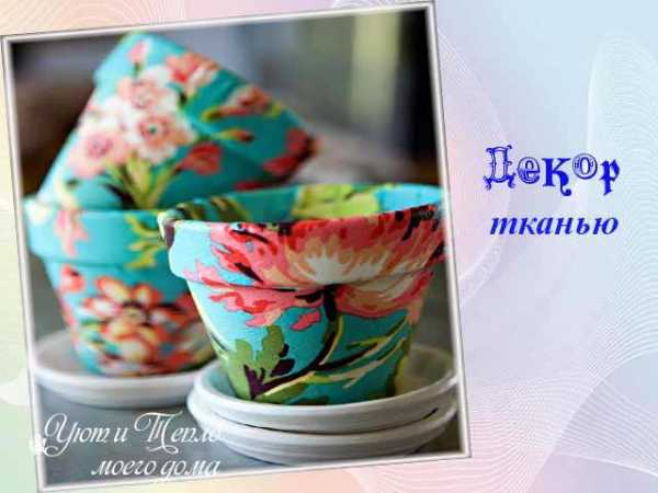 Отличной идеей декора цветочных горшков является оформление горшочков тканью. Для такого дизайна лучше всего подходят горшки из керамики или пластмассы, потому что их поверхность нужно будет для прочности затирать наждачкой. После этого на всю поверхность горшка наносится клей и аккуратно с одного края по всей длине основания наматывается текстиль. При этом во избежание образования пузырьков воздуха ткань надо разглаживать. Далее с двух сторон необходимо сделать надрезы в форме треугольника и окончательно закрепить ткань.