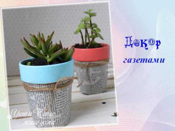 Оригинальный декор цветочных горшков, мастер класс которых можно легко найти в Интернете – это декупаж. Техника этого украшения базируется на использовании бумажных картинок, цветной бумаги, и салфеток. Подходит такой метод для горшочков из глины или пластика.