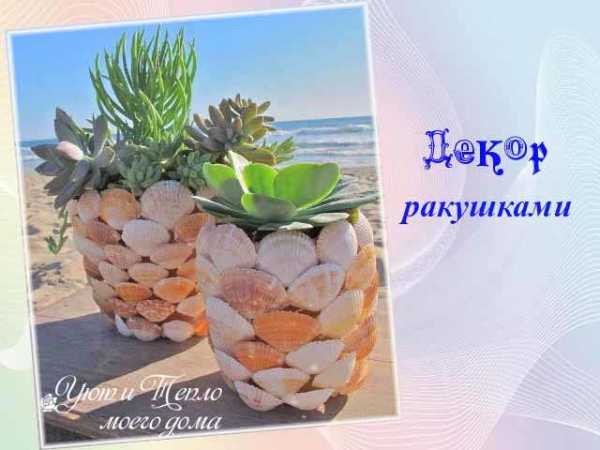 Подходит для морской тематики. Если интерьер комнаты выполнен преимущественно в голубых и белых оттенках, то такой элемент декора, как украшенные ракушками цветочные горшки, сделает акцент на морском стиле. Взгляд, падающий на цветочные горшки с ракушками, будет мысленно уносить вас на морское побережье с белоснежным песком, теплыми волнами и свежим морским бризом. В качестве основания подойдут горшки сине-голубых оттенков, контрастирующих с белыми ракушками.