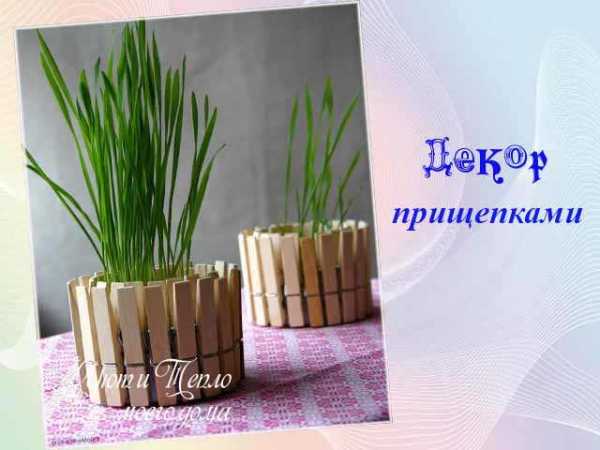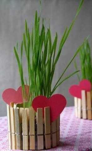 Маленькие горшочки для фиалок или суккулентов можно украсить прищепками.