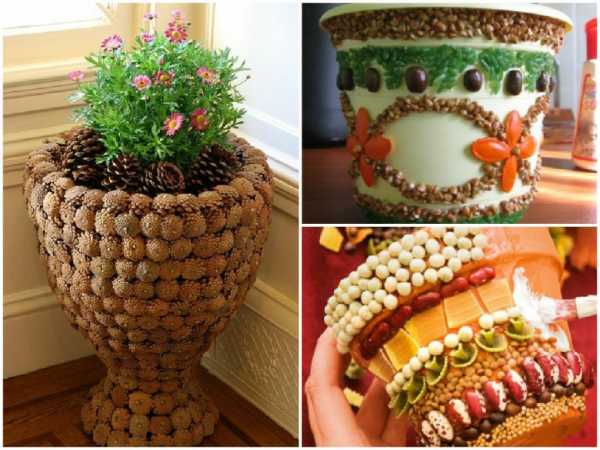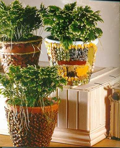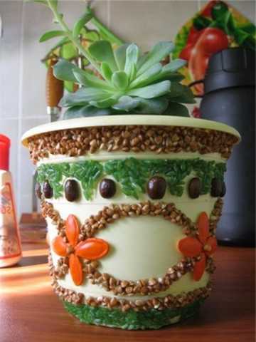 Такие горшки будут особенно актуальны в столовой комнате или на кухне. Для изготовления понадобится самый простой глиняный горшок, клей и различные виды круп — горох, фасоль, рис, гречка, пшено. Что касается самого процесса наклеивания круп на горшок, то здесь можно полностью довериться своим творческим порывам. Можно сочетать как разные крупы по форме, размеру и цвету, так и украсить горшок полностью рисовой крупой, а затем раскрасить его красками. Кроме того, можно сочетать крупу с различными бусинами или стразами.