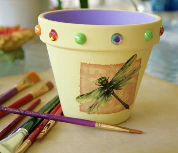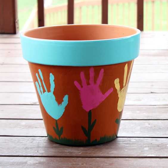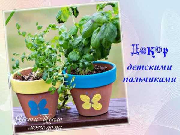 Для украшения цветочных горшков обязательно привлекай своих детей! На вазоне можно оставить отпечатки ладошек, ножек или с помощью отпечатков пальцев рисовать цветы и бабочки.