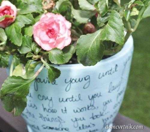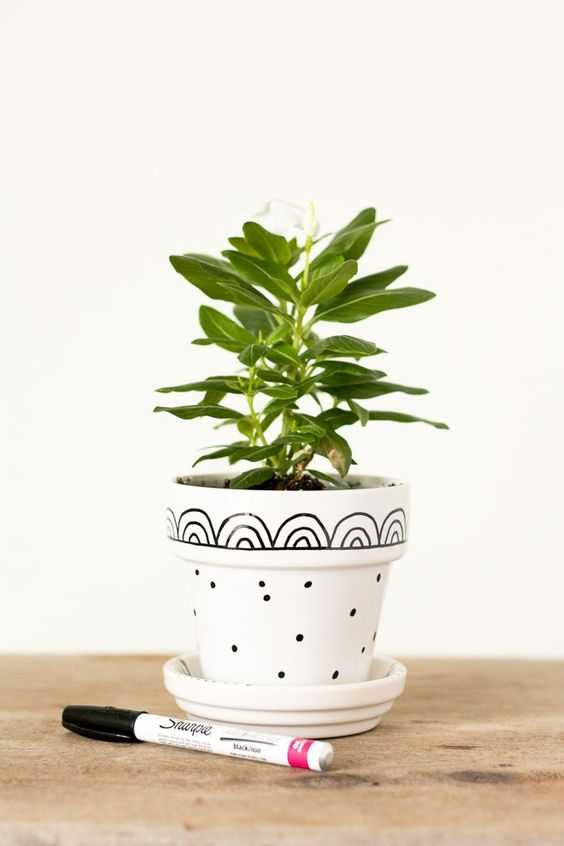 Цветочный вазон покрасить белой краской и потом с помощью черного маркера нанести узор или написать пожелание, название цветка или девиз.