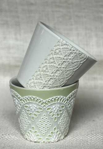 Другой горшок украшен по краю кружевом, вырезанным из круглой салфетки.