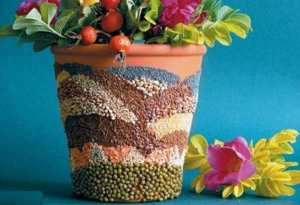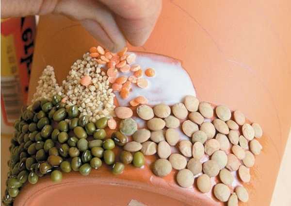 Крупы. Подготовленная посуда покрывается клеем, на который крепятся самые разные крупы. Горшок для цветов приобретет более оригинальный дизайн, если с помощью круп на нем изобразить картинку, предварительно нарисованную на изделии. При работе с крупами лучше всего использовать зерна с плоскими краями, например, горошины или чечевицу.