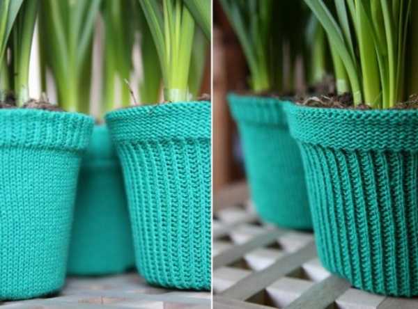 Умение вязать спицами или крючком тоже нужно использовать, размышляя о том, как украсить горшки своими руками – фото симпатичных кашпо тому доказательство. Если вязать вы пока не умеете, то отрежьте рукава от старого свитера и превратите их в наряды для цветочных вазонов.