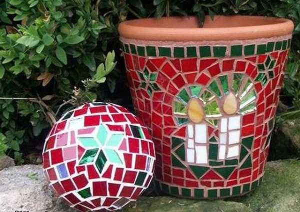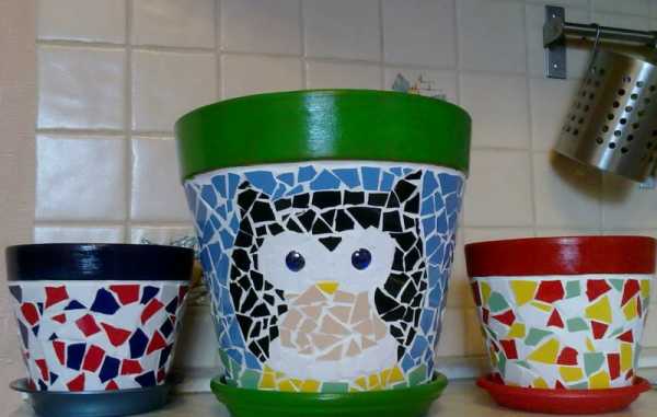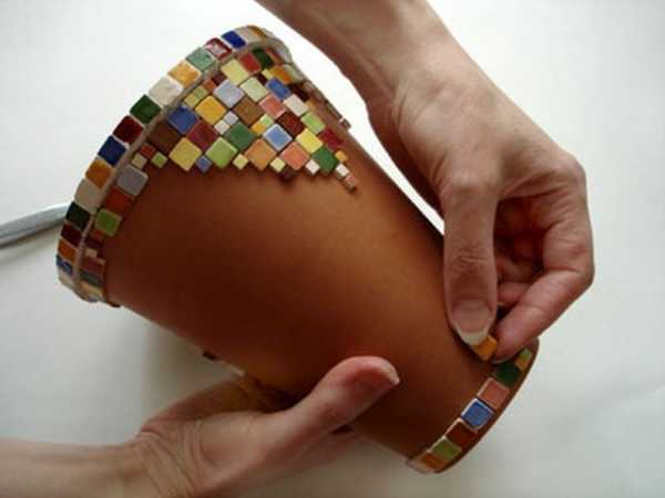 7. Декорирование керамического цветочного горшка в стиле «мозаика». Возьмите кусочки красивой разбитой тарелки, чашки и т.п., наклейте на горшок, а оставшиеся места затрите при помощи строительной или гипсовой смеси.