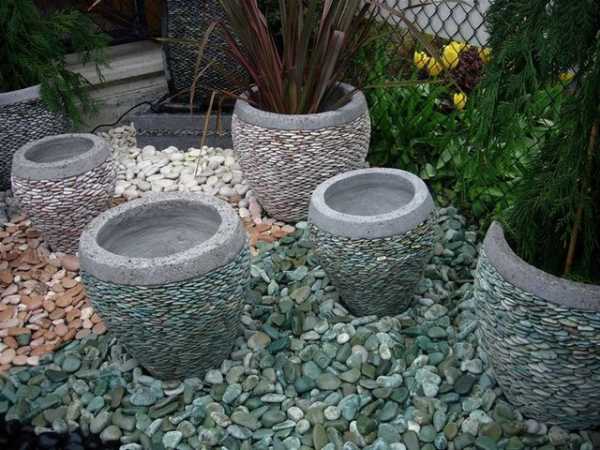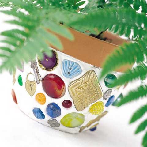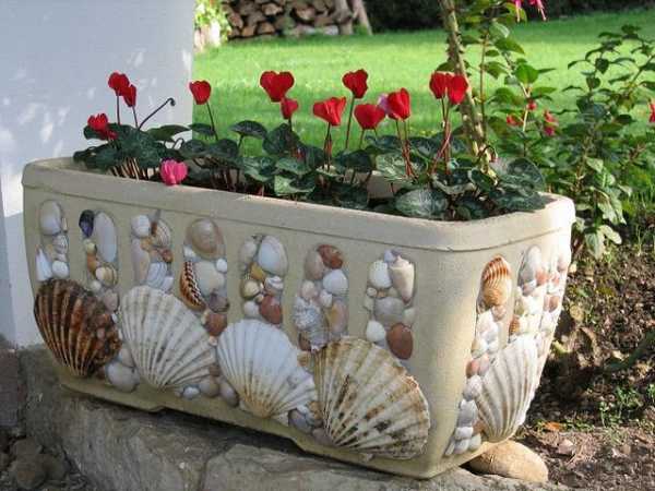 В каждом доме есть сувениры, привезенные с моря, такие, как камушки, ракушки и разноцветные стеклышки, с помощью которых можно оформить емкости для комнатных растений. Также морские сувениры можно комбинировать с самыми разнообразными мелкими деталями, например, с монетками, пуговичками, осколками разбитой посуды, или керамической плиткой.