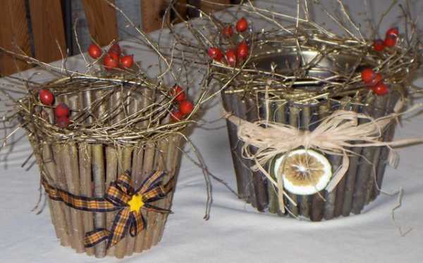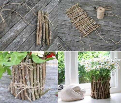 Прикольный декор горшка можно сделать из веточек от деревьев: нарезать их одинаковой длины и приклеить на горшок, предварительно обмотанный мешковиной.
