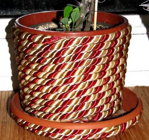 Отличным украшением для цветочной посуды является шнур. Самое простое – аккуратно обмотать им старый горшок, чтобы не было просветов. Немного сложнее, но намного эффектнее – приклеить к поверхности зернышки кофе, ракушки, камушки, пуговицы, брошки, значки или другие элементы декора. Также декор можно использовать для того, чтобы скрыть неровности обмотки или другие дефекты.