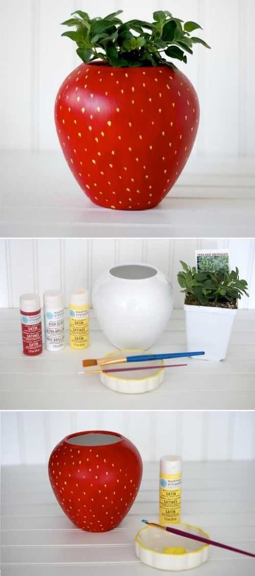 3. Похожий на предыдущий способ украшения цветочного горшка. Используйте фото-инструкцию ниже, чтобы сделать цветочный горшок-клубнику своими руками.
