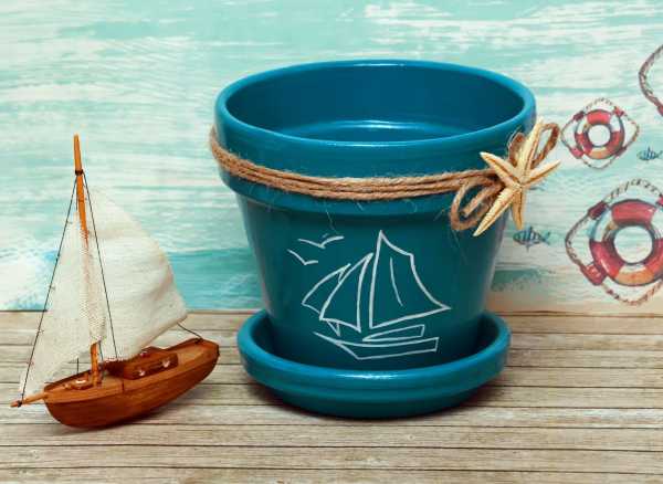 И так, предлагаем интересный вариант оформления цветочного горшочка в стиле моря.