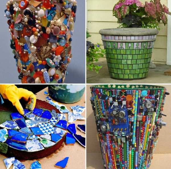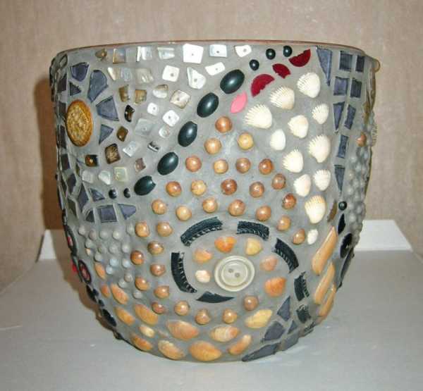Этот вариант потребует от тебя много терпения, но ведь оно того стоит! Для декора вазона можно использовать старые битые тарелки или чашки, бусины и даже морские камушки.