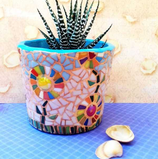 Можно также красиво украсить цветочный горшок кусочками битого стекла или посуды, выложив его мозаикой. Создавать такой шедевр ручной работы нужно особенно аккуратно, чтобы не пораниться. Когда клей с мозаикой высохнет, следует нанести сверху слой акрилового лака.